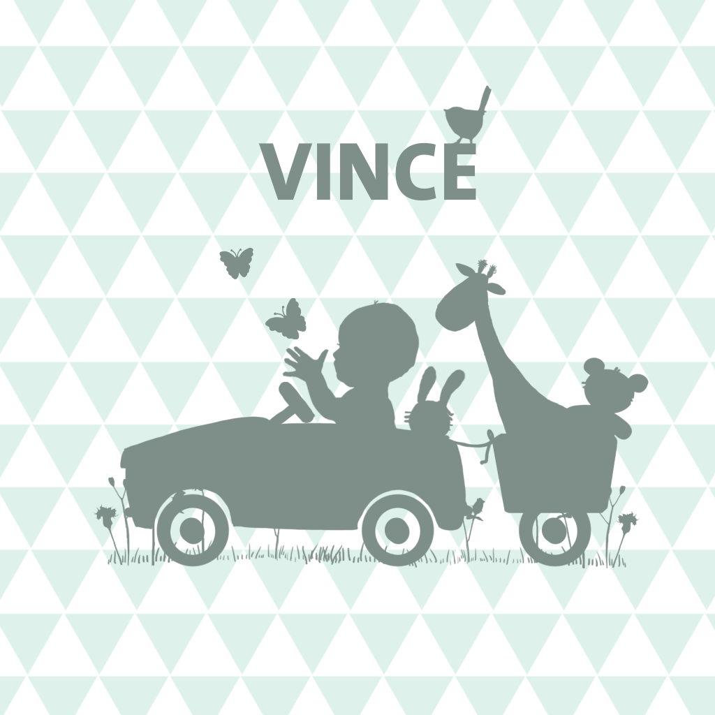 Mooi hip geboortekaartje van baby jongen in trapauto met konijn, beer, giraf en vlinders. Met grafische driehoek achtergrond in mintgroen.