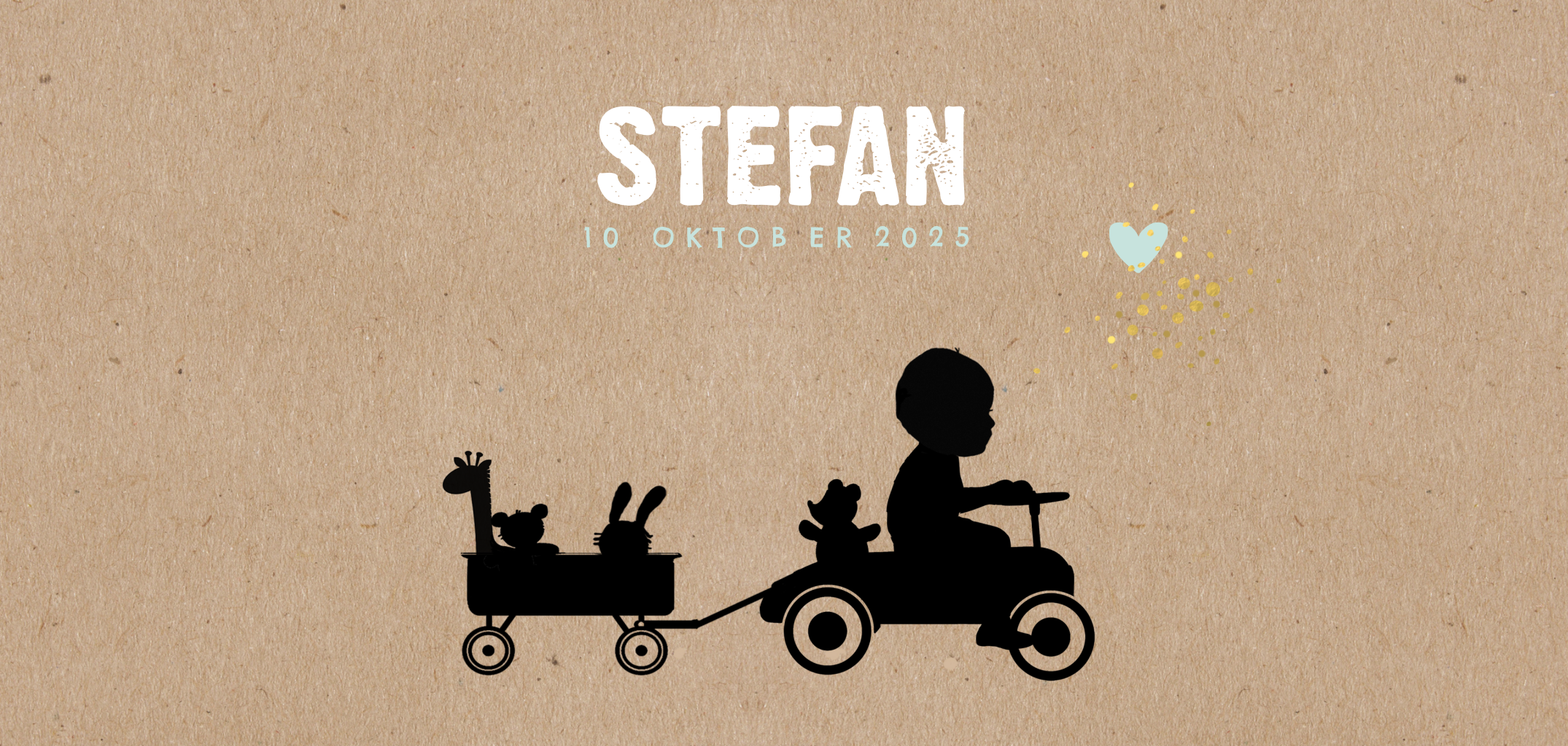 Kraft-achtergronden geven een stoere uitstraling! Speciaal aan dit geboortekaartje is het jongetje met zijn wagentje in silhouet. Het hartje en de glitters in goudlook maken hem helemaal af!
