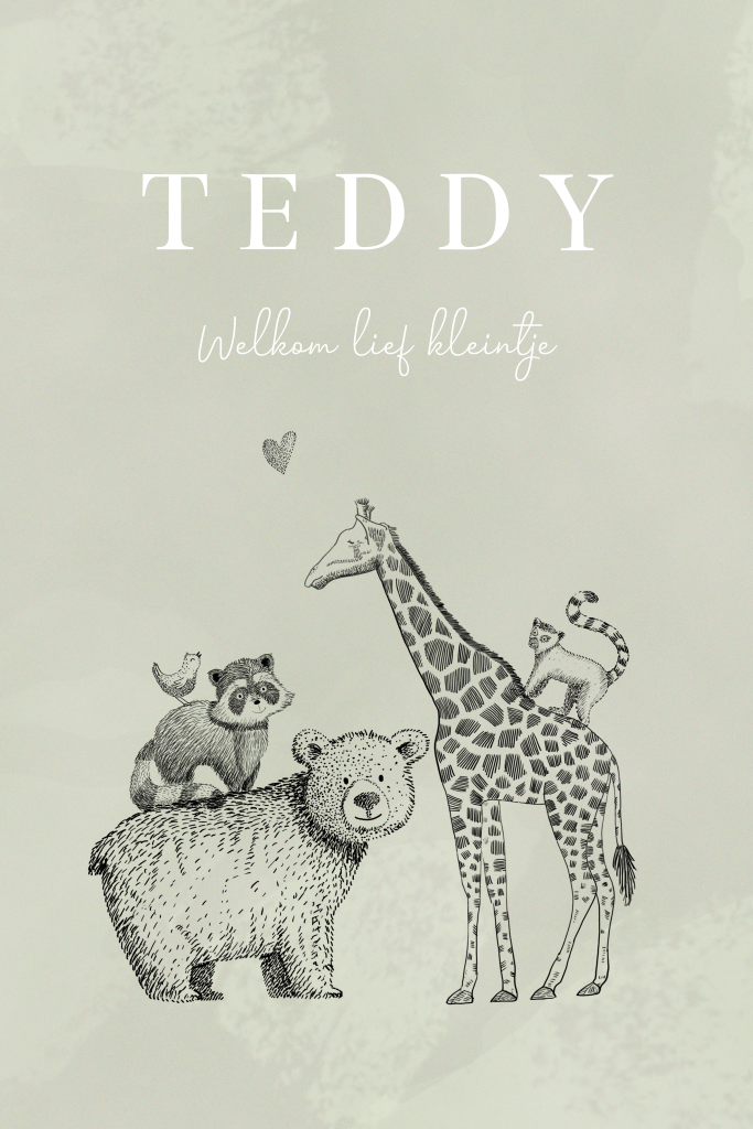 Een vrolijk en hip geboortekaartje voor jullie kleintje. Op het kaartje zie je vrolijke getekende dieren! Op het kaartje staan de pentekeningen van een giraf, beer, wasbeer, aapje en vogeltje op een groene achtergrond. Pas dit kaartje volledig naar wens aan in onze online editor.