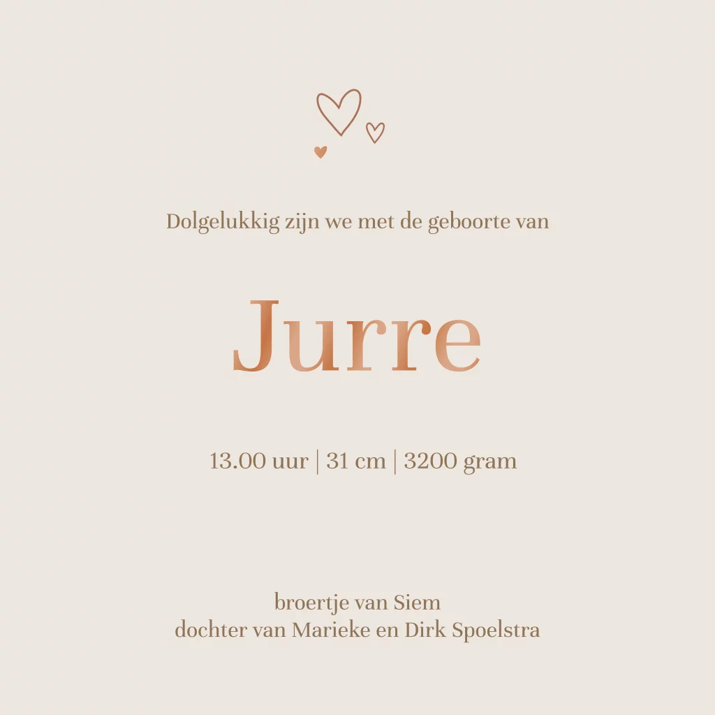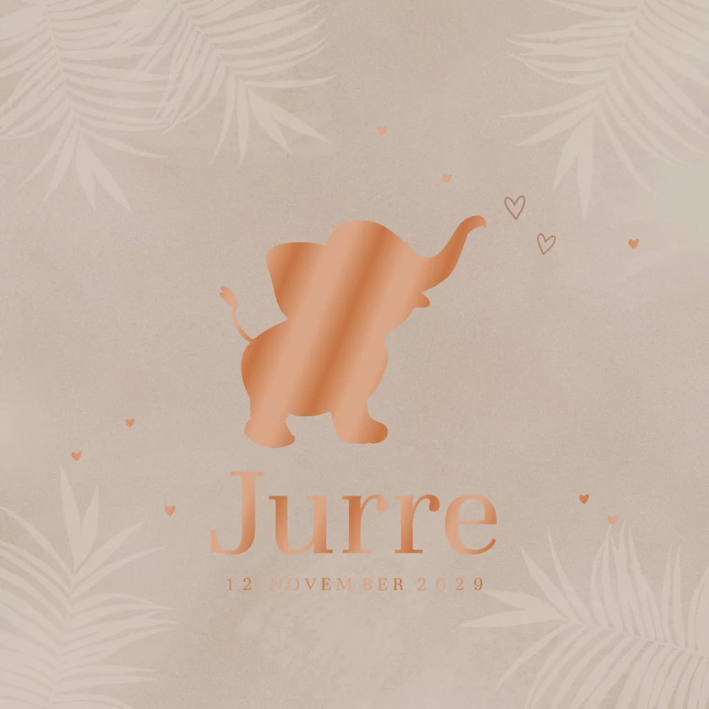Wat een tof geboortekaart voor jouw kindje. Dit kaartje heeft een hoogglans olifantje in het midden van het kaartje. De achtergrond heeft een bruine taupe kleur met lichte takjes. Het geboortekaartje heeft een dubbel vierkant formaat.