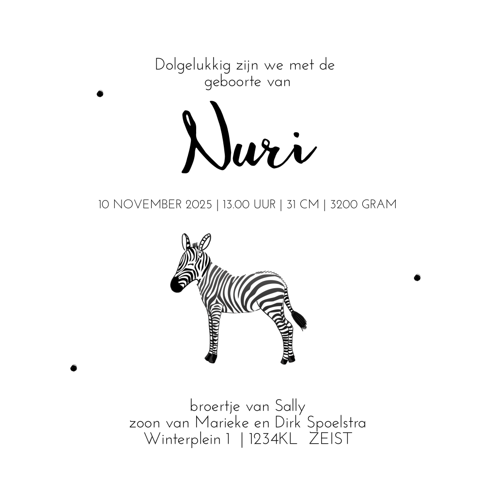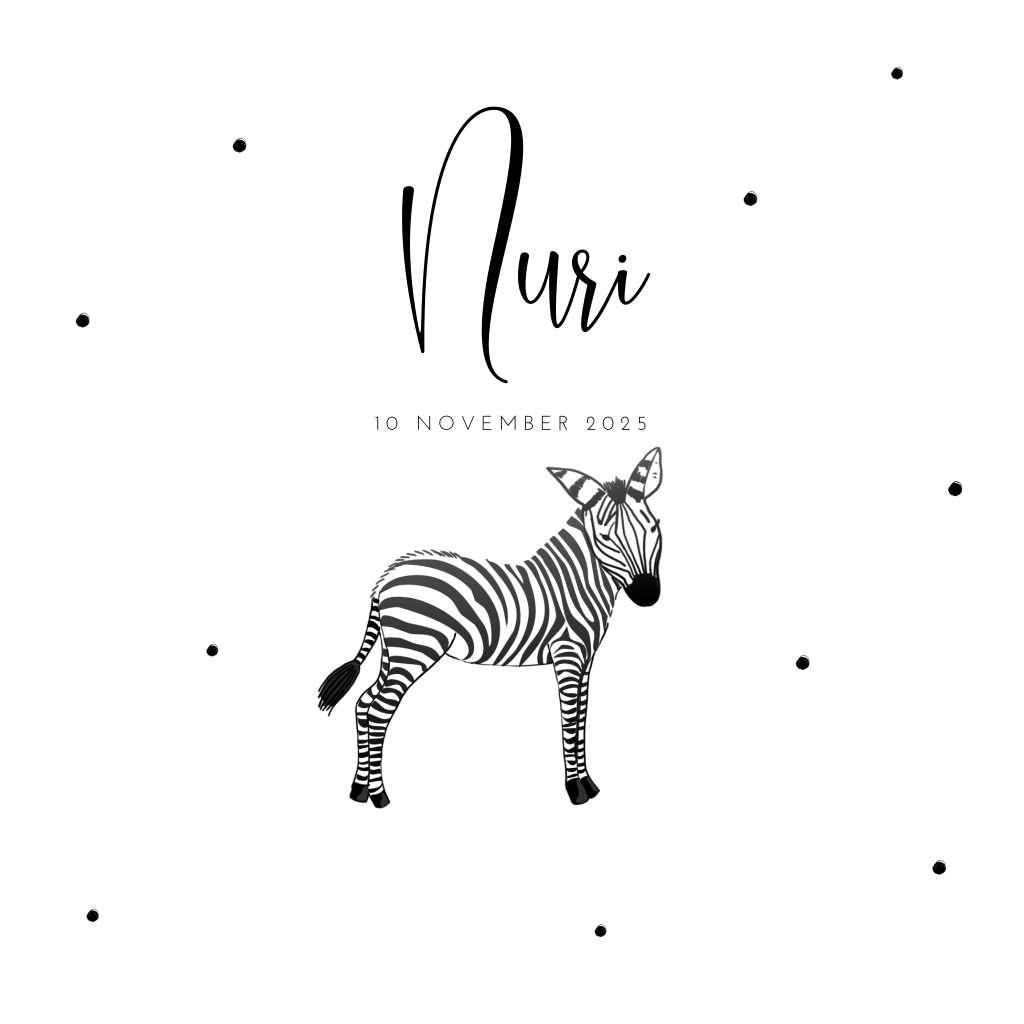 Een hippe geboortekaart voor een zoontje! Met vrolijke stippen en getekende zebra in themakleuren zwart-wit. Maak hem compleet met eigen teksten en een bijpassende envelop!