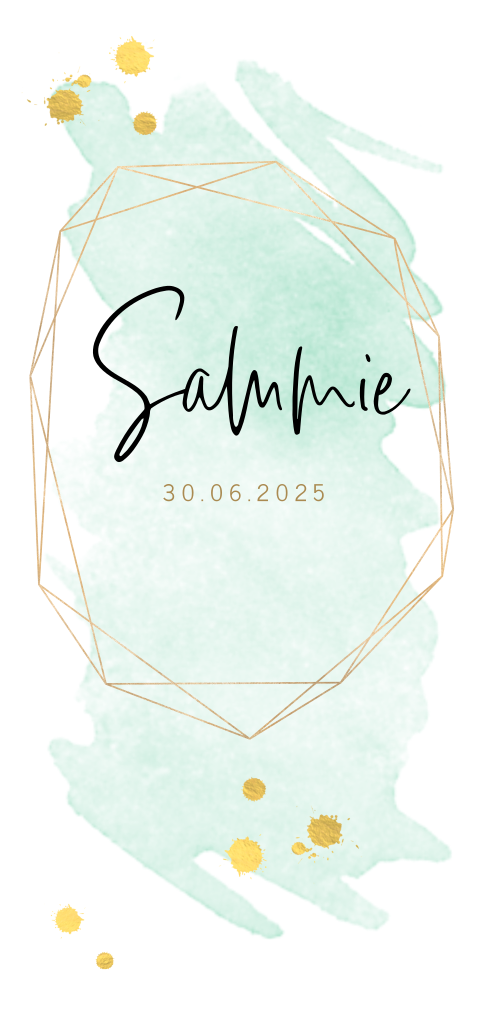 Een hip geboortekaartje voor een jongen! Met watercolour in mint, een geometrische vorm en verfspatters in goudlook. Lettertypes en teksten zijn aan te passen in de online editor.