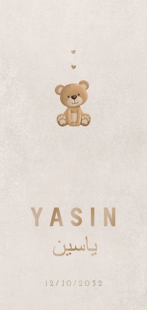 Een lief geboortekaartje voor jullie toekomstige kleintje. Het kaartje heeft een schattige illustratie van een teddybeertje en Arabische tekens. Het kaartje heeft mooie aardetinten als kleuren.Dit product maakt onderdeel uit van deze set.