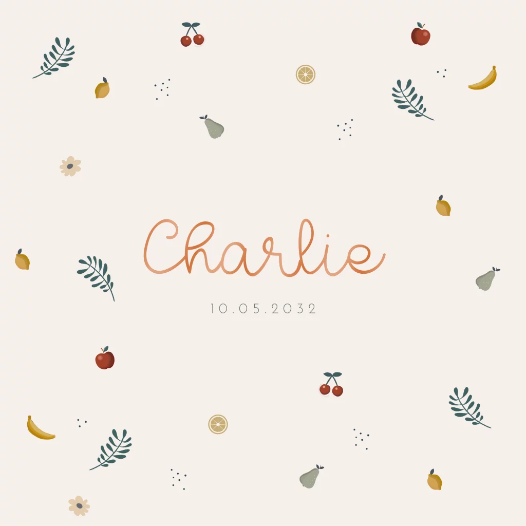 Dit is een hip geboortekaartje voor jullie zoon of dochter. Op het kaartje staan illustraties van diverse soorten fruit en blaadjes. De naam wordt gedrukt in hoogglans en geeft dit kaartje een luxe uitstraling. Benieuwd naar dit kaartje? Bestel een proefdruk en bekijk het kaartje in het echt!