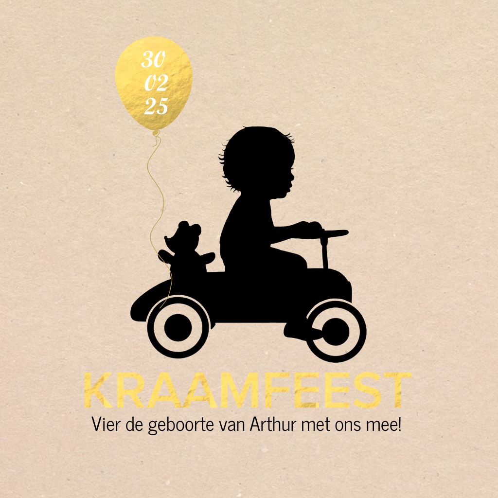 Wat een trendy kraamfeestkaart met een silhouet van een jochie op een speelgoedauto en een ballon in goudlook op een achtergrond van kraft! Ook tof zijn de letters KRAAMFEEST in goudlook. Leuk voor een jongen!