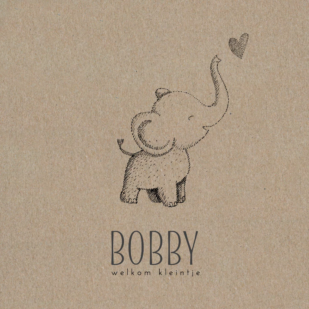 Hippe geboortekaart voor de geboorte van je zoontje met een pentekening van een lief olifantje op een echt kraft karton achtergrond.