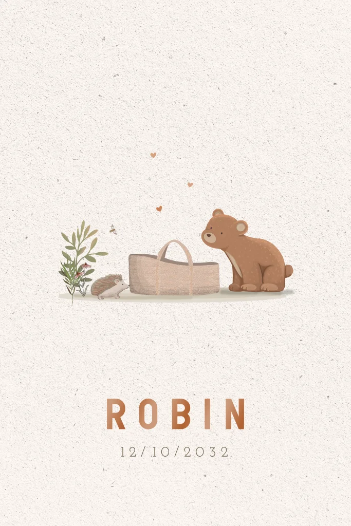Wat een lief geboortekaartje voor jullie zoon of dochtertje! Het kaartje heeft een beige achtergrond met daarop de illustratie van een beertje, een egeltje bij een mandje. De letters in hoogglans geven een luxe uitstraling aan deze babykaart.