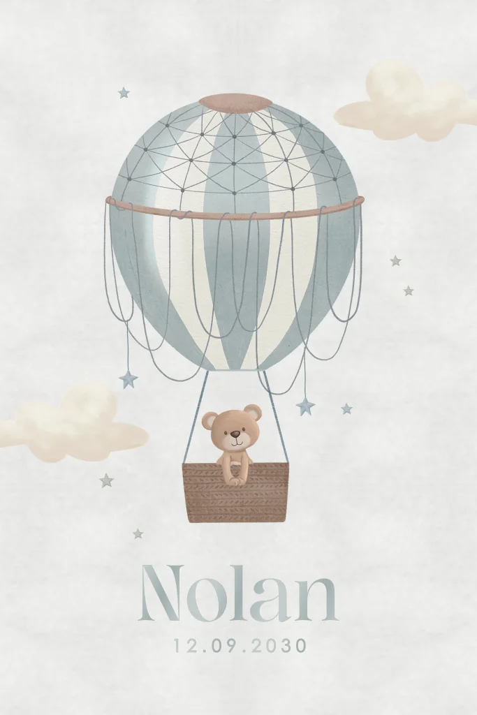 Wat een lief geboortekaartje voor jouw zoon! Het kaartje heeft blauwe tinten. In het midden zie je een luchtballon vliegen tussen de wolkjes. In de luchtballon zit een beertje. Pas het ontwerp naar wens aan in onze online editor.