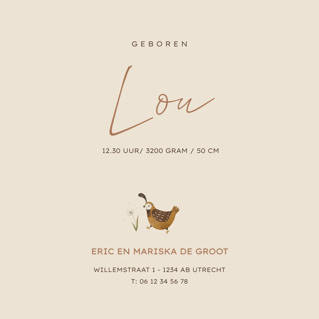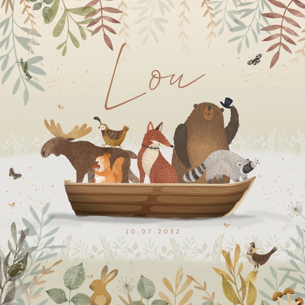 Wat een vrolijk geboortekaartje! Het kaartje heeft een vrolijk ontwerp met verschillende bosdieren in een bootje. Daanaast zie je verschillende takjes. Pas het ontwerp naar wens zelf aan.
