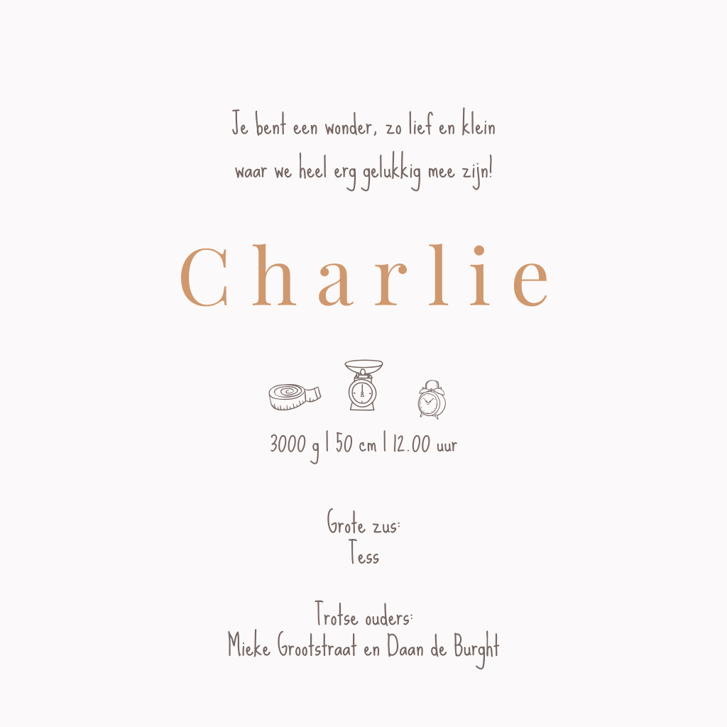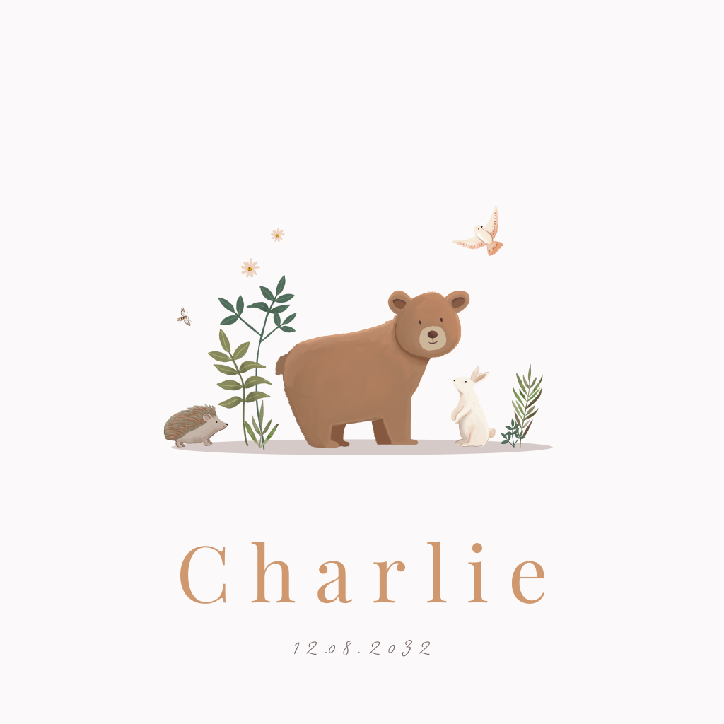 Wat een lief geboortekaartje met ronde hoeken. Het kaartje heeft een schattige illustratie van verschillende bosdieren. Je ziet een beertje, egel, konijntje en vogeltje. Het kaartje is volledig te personaliseren in onze online editor.