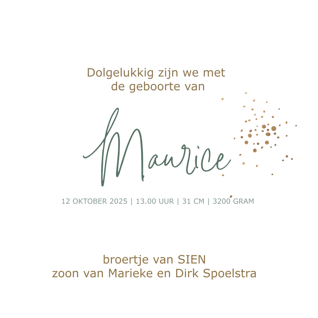 Modern geboortekaartje voor een jongen! Met groene blaadjes, verfspetters in goudlook en een sierlijk lettertype.