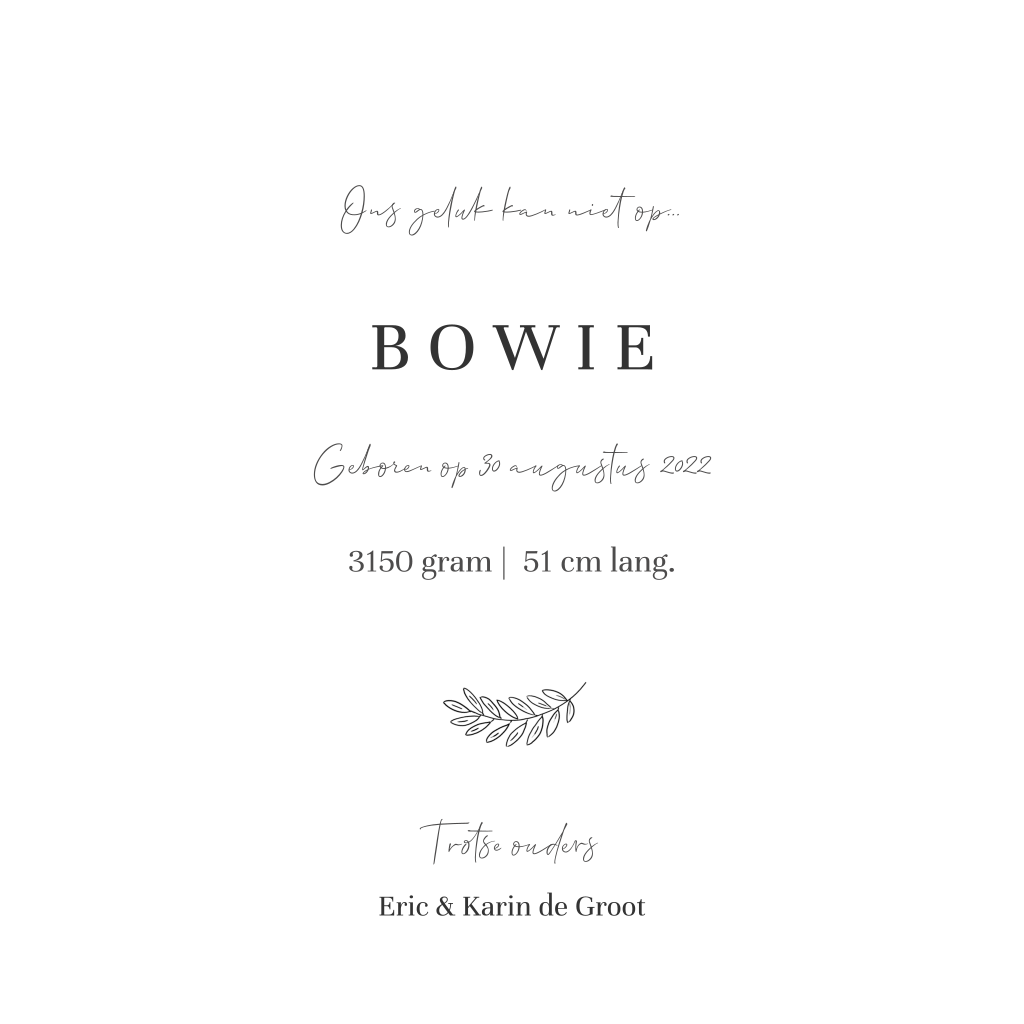 Een tijdloos en stijlvol geboortekaartje voor jullie toekomstige kleintje. Op het kaartje zie je een prachtige illustratie van een boom. Het kaartje komt het mooiste tot zijn recht op oud-hollands papier. Bestel een proefdruk om het kaartje in het echt te bewonderen.