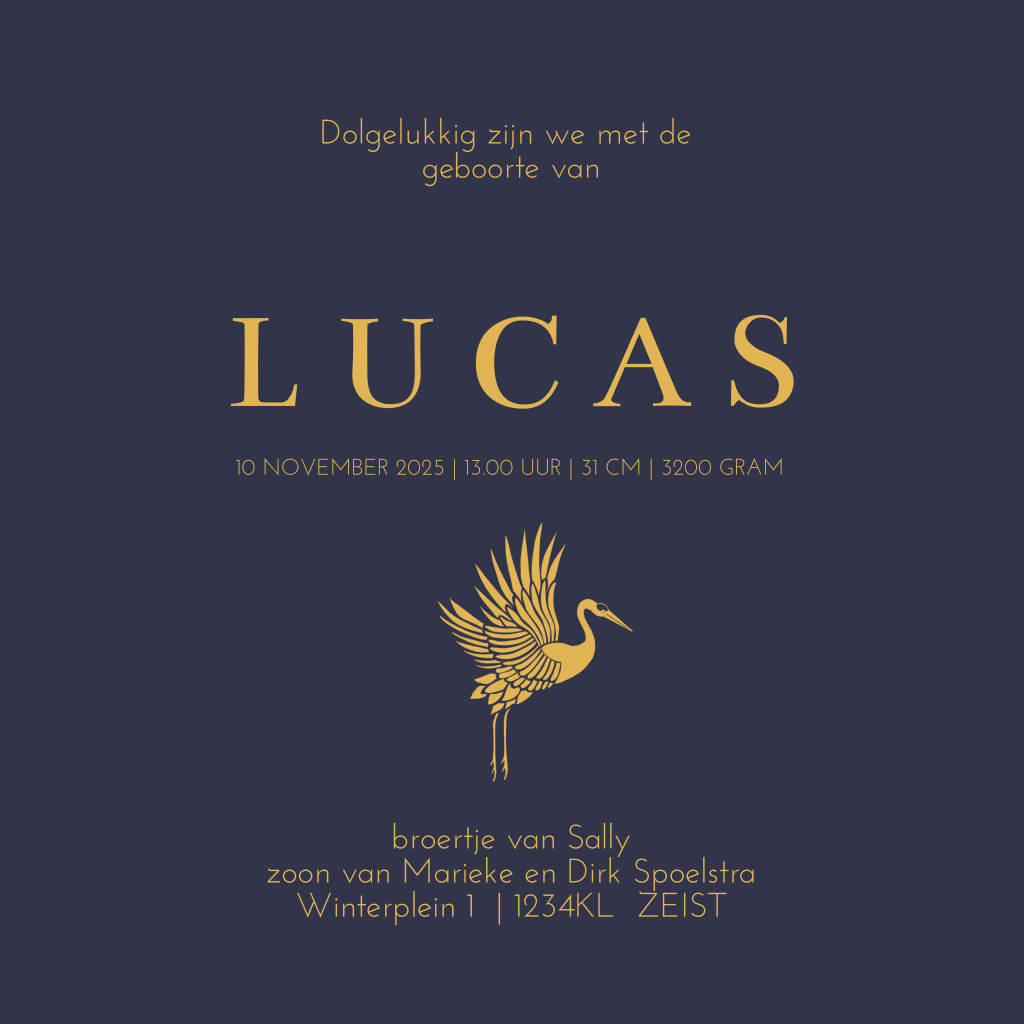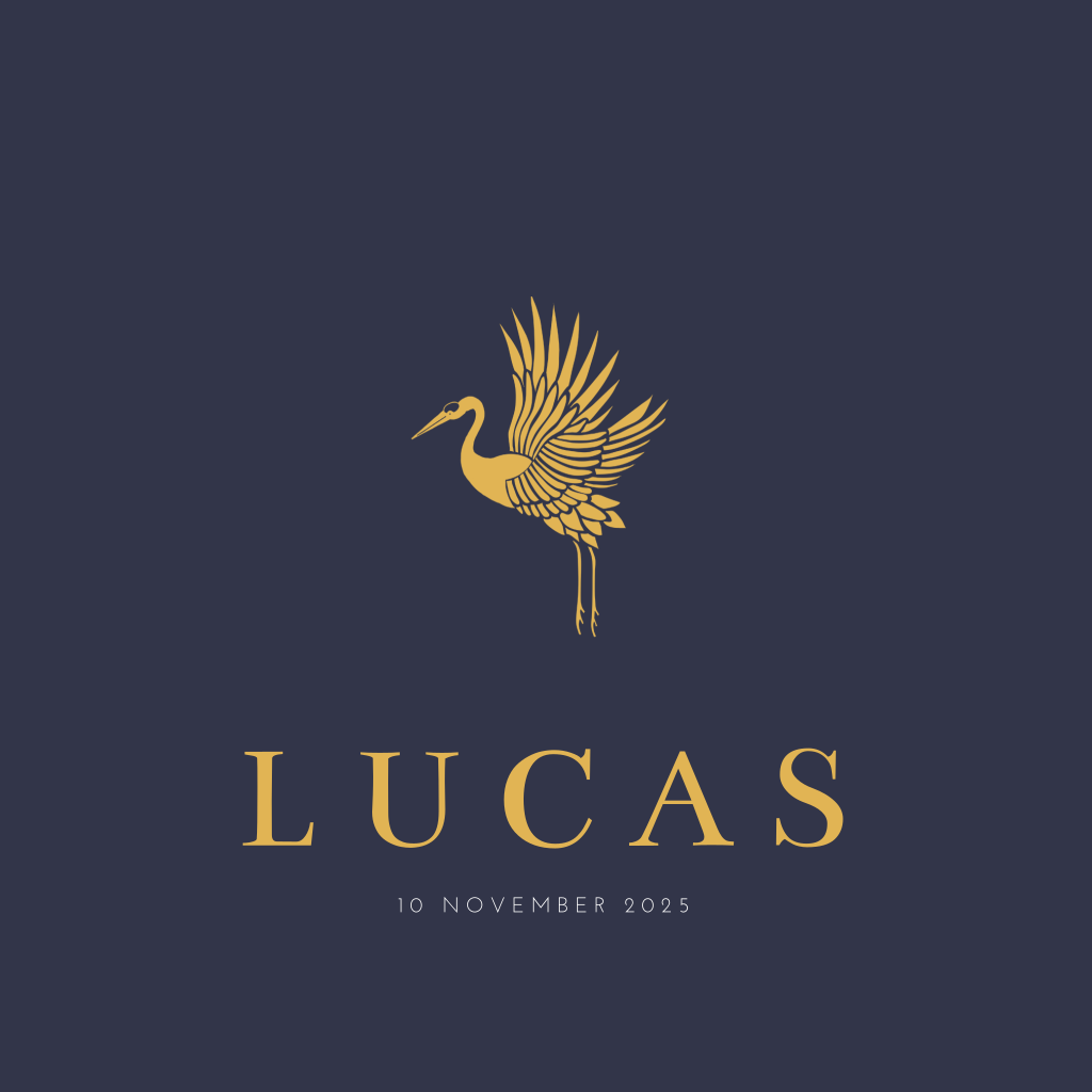 Leuk voor een zoontje is dit hippe, donkerblauwe geboortekaartje met een unieke illustratie van een kraanvogel. Kleuren en lettertypes zijn eventueel ook aan te passen in de online editor! Maak jij hem compleet met eigen teksten en een bijpassende envelop?