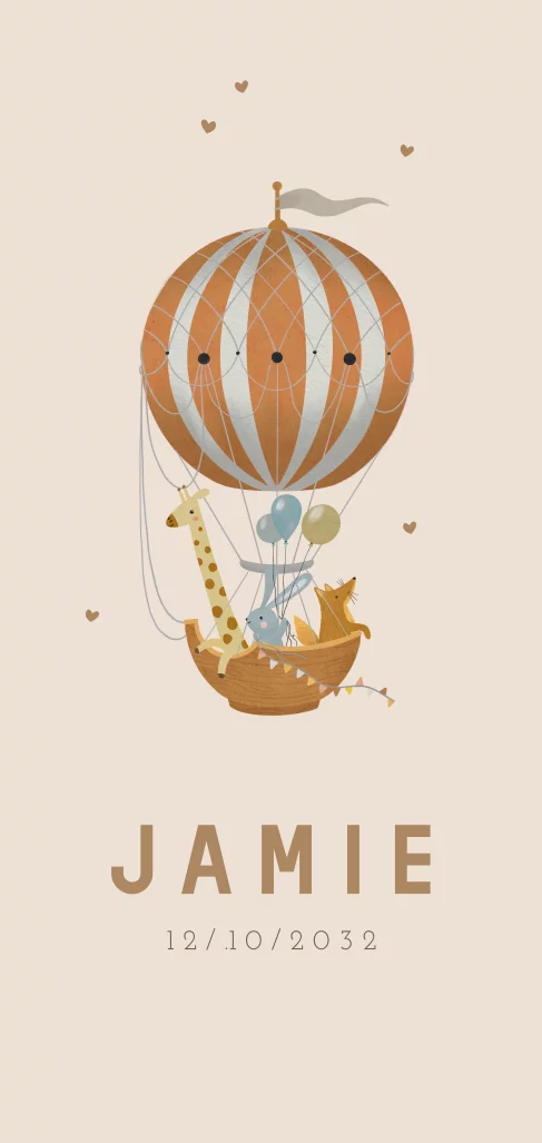Een vrolijk geboortekaartje voor jouw kindje! Het langwerpige kaartje heeft een beige basis met daarop een luchtballon vol met dieren. In de lucht zie je hartjes. Pas het ontwerp naar wens aan.
