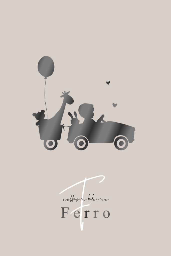 Een stoer geboortekaartje voor jullie toekomstige zoontje. Het kaartje heeft een silhouetje met jullie zoontje rijdend in een auto. Achter de auto rijdt een kar met verschillende knuffeldieren. Het silhouetje is gedrukt in prachtige zwarte hoogglans en is naar wens aan te passen naar een andere kleur folie in onze online editor.