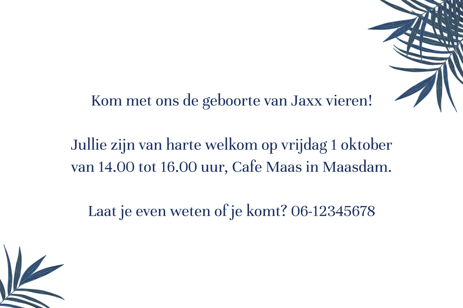 Nodig familie en vrienden uit voor het kraamfeest van jullie zoontje met deze bijpassende kraamborrelkaart. De tekst 'babyborrel' de hartjes en het olifantje zijn in goudfolie, mooi accent! De rest van de tekst en de palmbladeren in de hoek zijn donkerblauw, een perfecte match met het geboortekaartje.