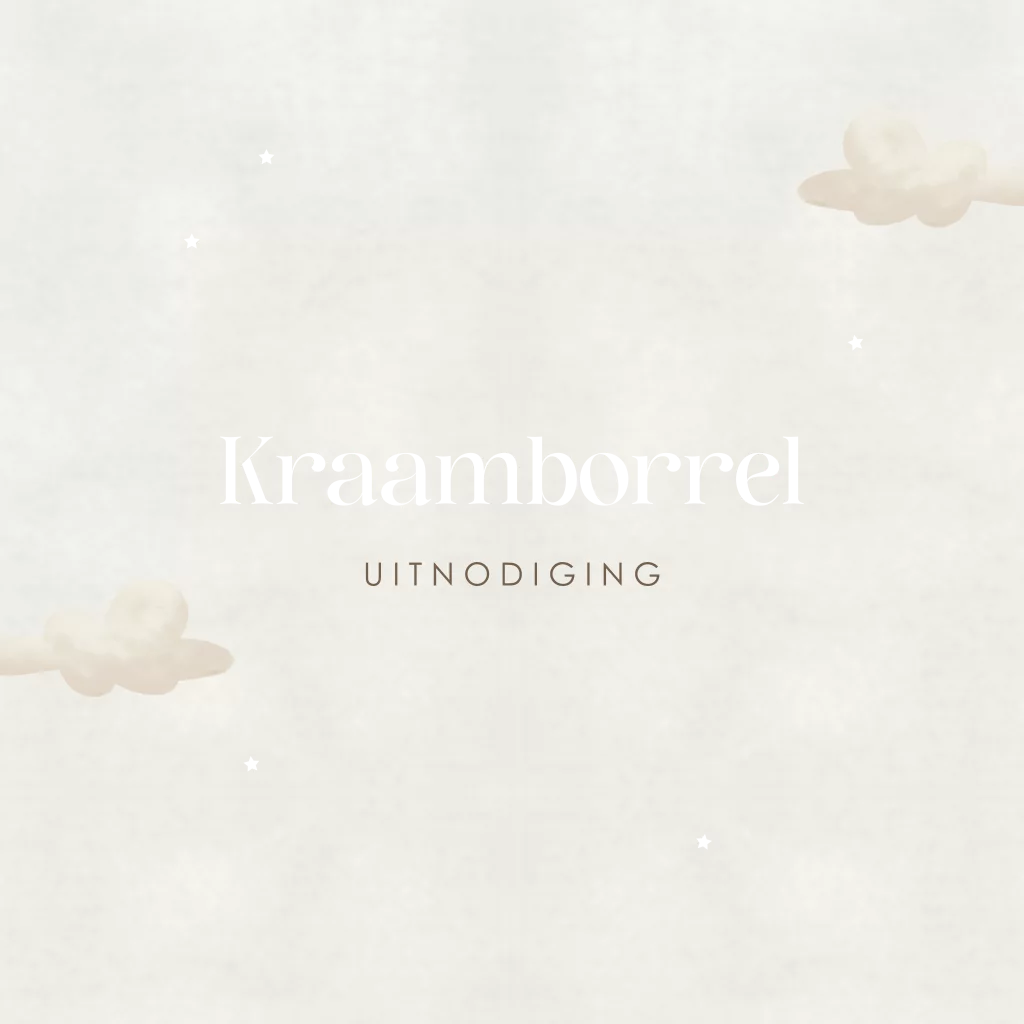 Wat een lief kraamborrelkaartje voor jouw kindje! Het kaartje heeft beige tinten. Op het kaartje zie je wolkjes, sterretjes en goudfolie details. Pas het ontwerp naar wens aan in onze online editor.