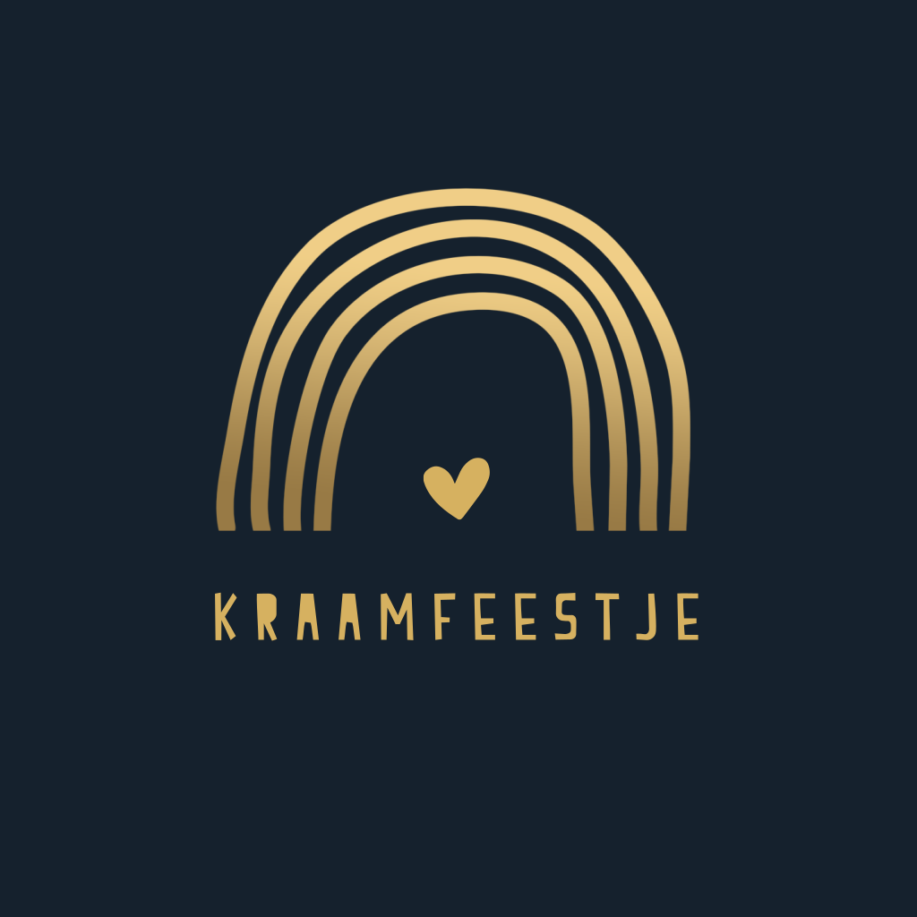 Hippe uitnodiging voro de babyborrel van je zoontje met een trendy regenboog in goudlook op een donkerblauwe achtergrond.