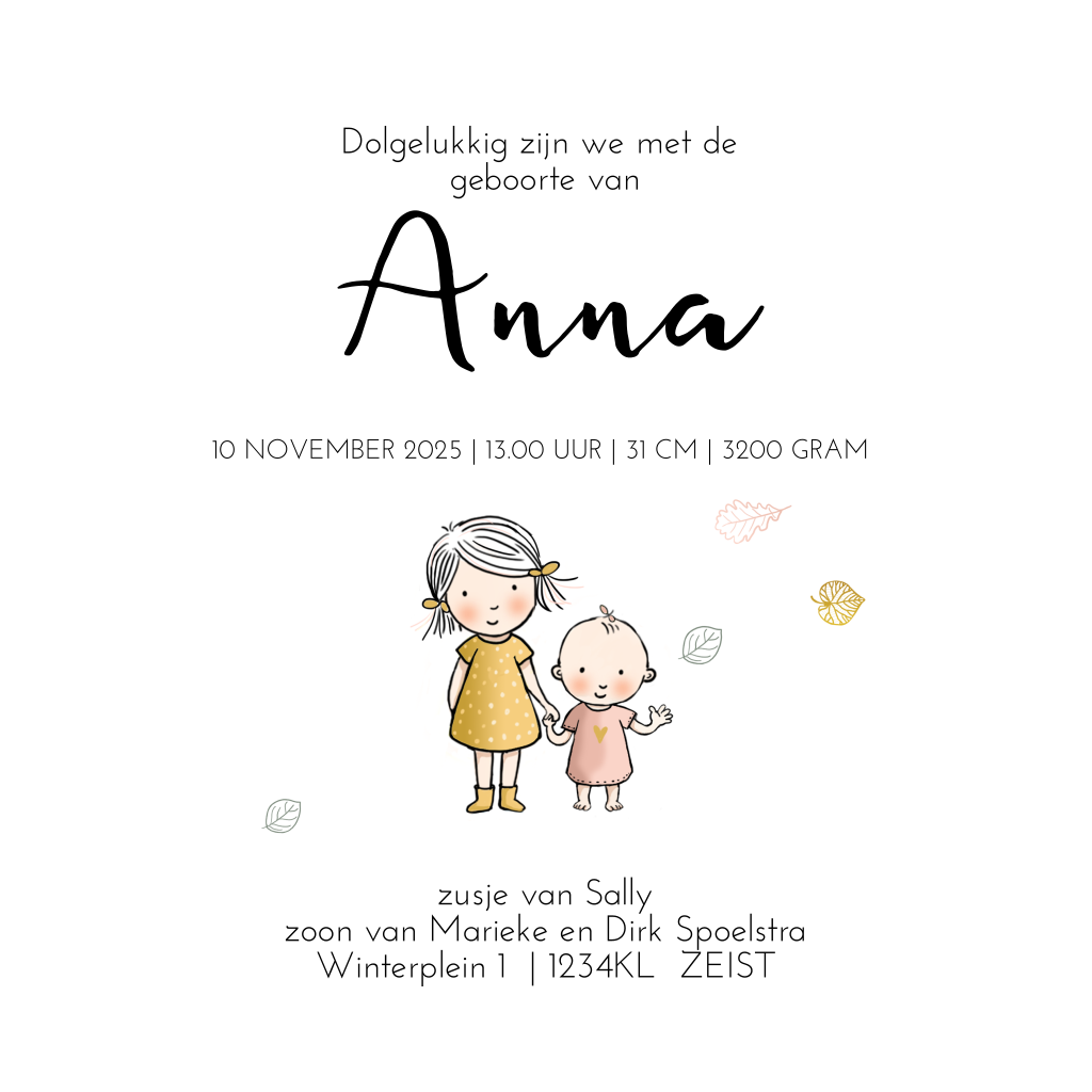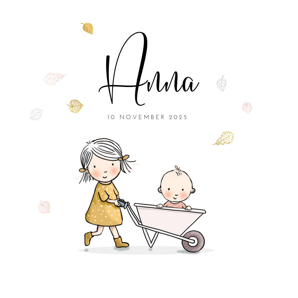 Dit geboortekaartje met een tekening van een meisje met haar zusje in een kruiwagen is ontworpen door Anet illustraties. Dit geboortekaartje in herfstthema is versierd met diverse, fijngetekende blaadjes. Leuk voor de geboorte van een zusje!
