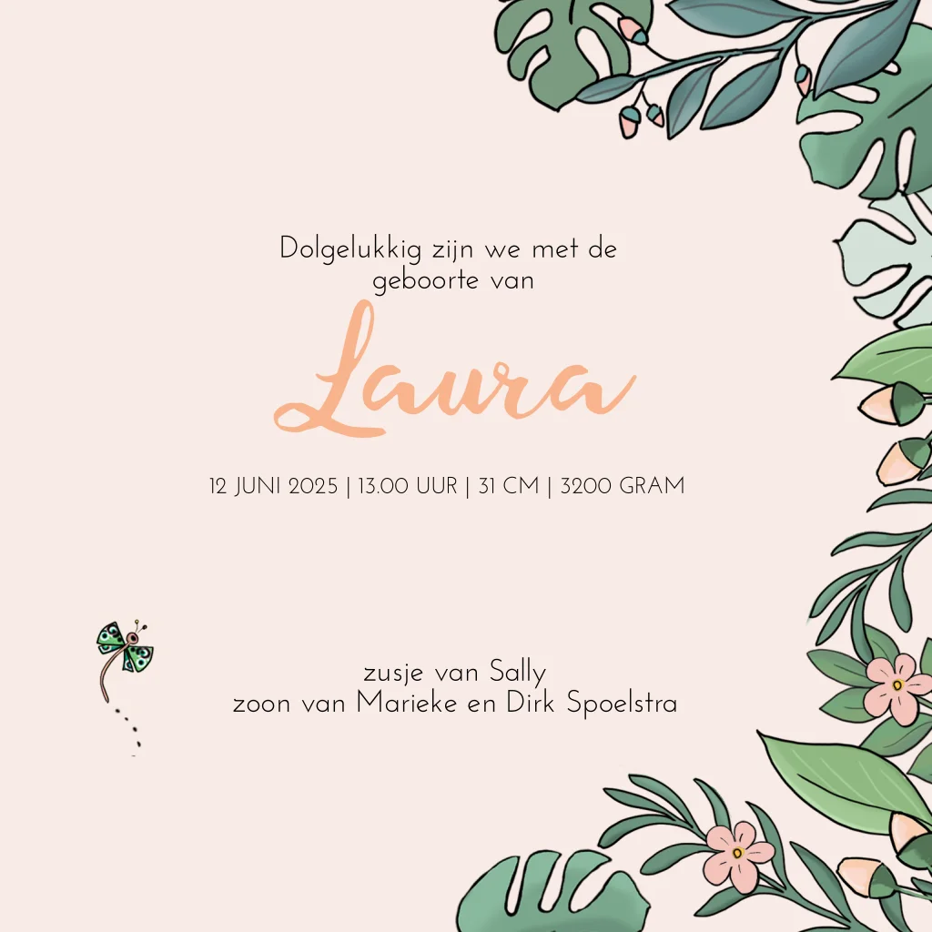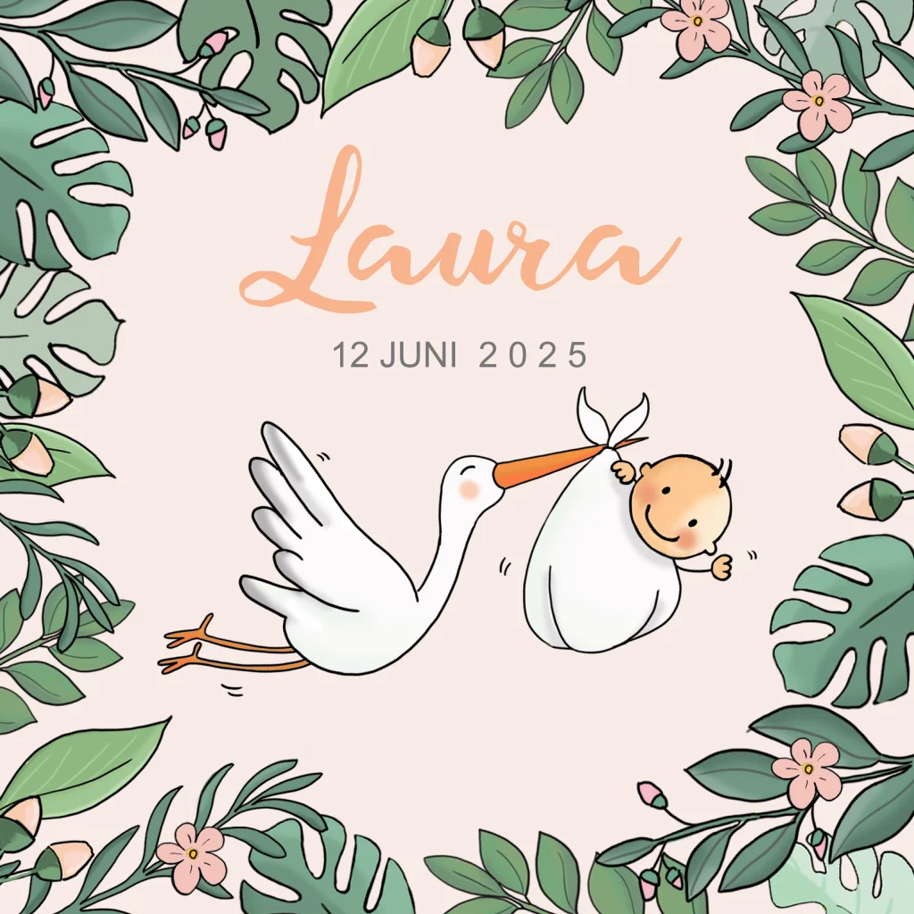 Illustratief babykaartje met een ooievaar die een baby komt brengen. De rand van planten combineert mooi met de lichtroze achtergrond en de bloemetjes. Leuk voor een meisje!