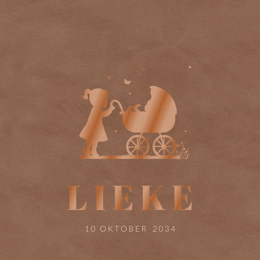 Een stijlvol geboortekaartje voor jouw meisje. Het kaartje heeft een vierkant formaat met bruine achtergrond. Daarop zie je een silhouetje van een grote zus achter de kinderwagen van haar zusje. De silhouetjes en naam worden gedrukt in hoogglans.