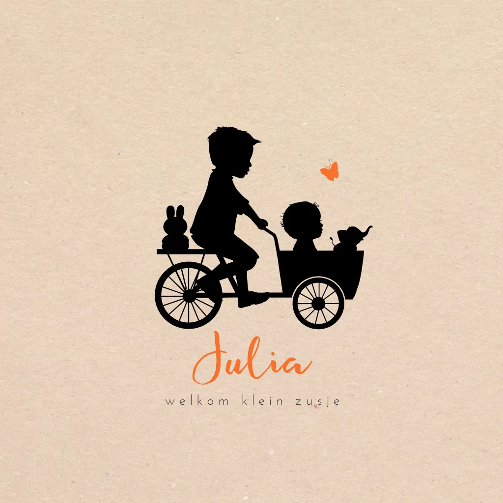 Stoere kraft papier geboortekaart met hip silhouet van een broertje en zijn baby zusje samen in de bakfiets met nijntje en een olifant.