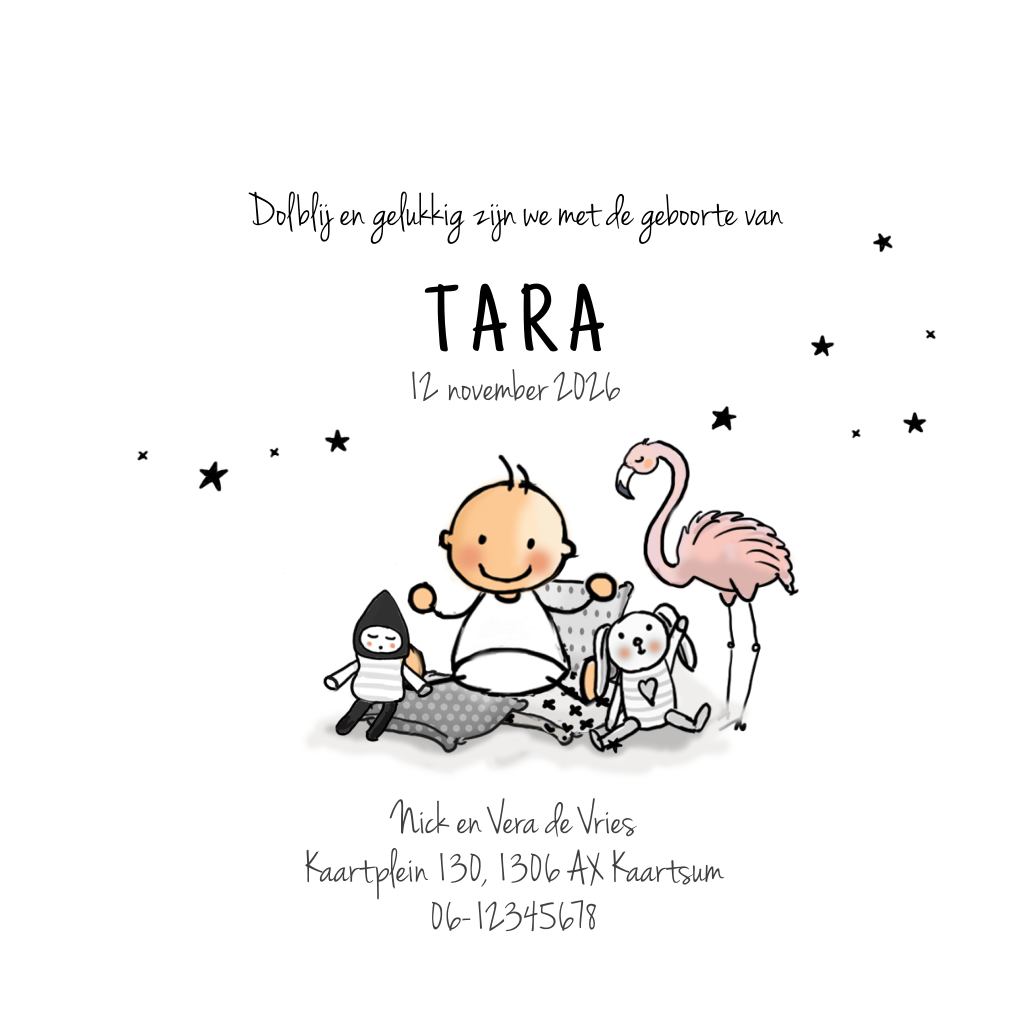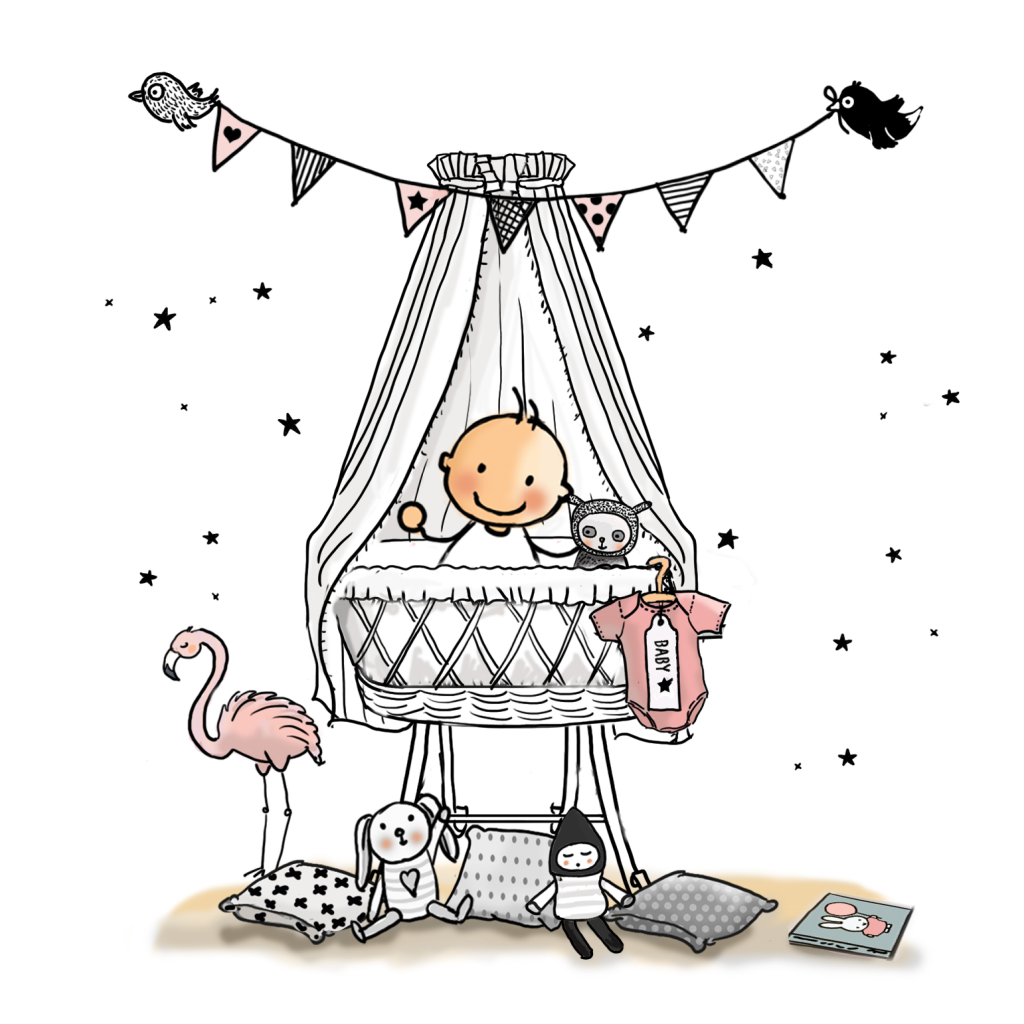 Bijzonder lief getekend geboortekaartje van baby in wieg met knuffels, vogeltjes en vlaggen.