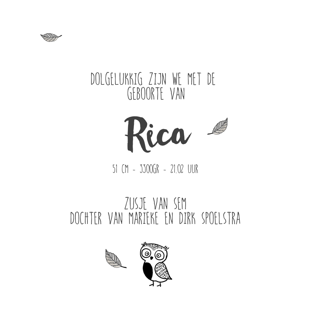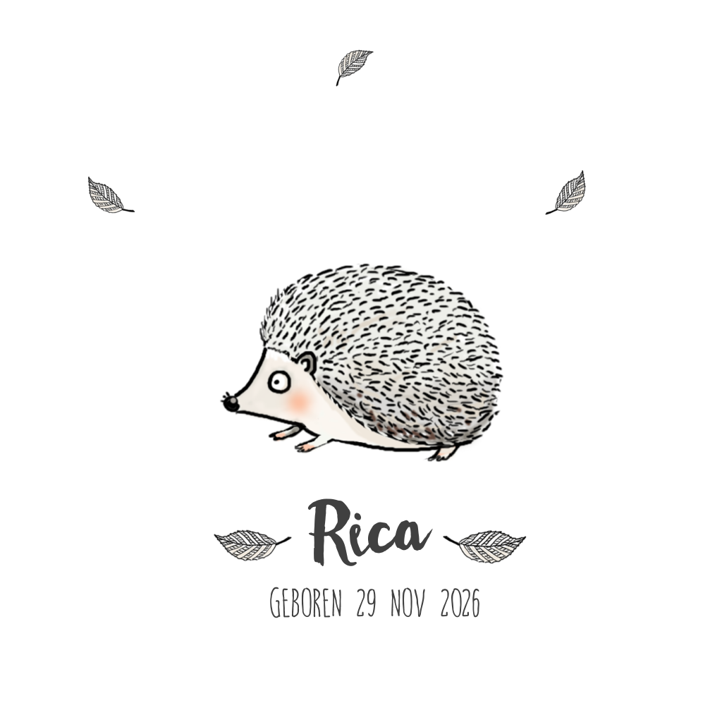 Super schattig geboortekaartje van een lief egeltje in zwart grijs wit met bladeren, kleine illustraties in de binnenkant
