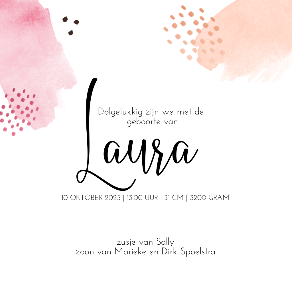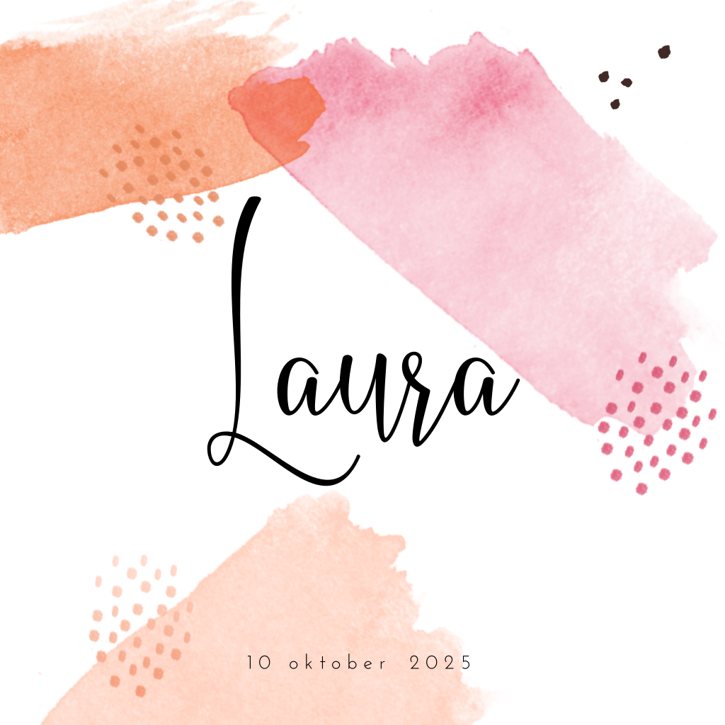 Hippe geboortekaart voor je dochtertje met watercolour verfstrepen in roze en peach. De roze stipjes maken dit kaartje echt trendy!