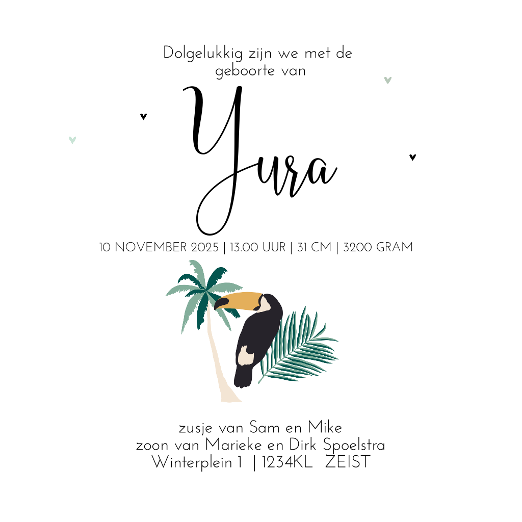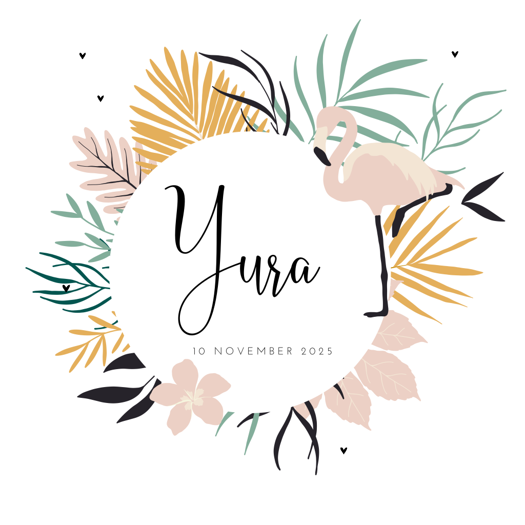 Trendy geboortekaartje als geboorteaankondiging van je dochtertje in jungle thema. Met hippe botanische bladeren en een flamingo is dit echt een stijlvol geboortekaartje!