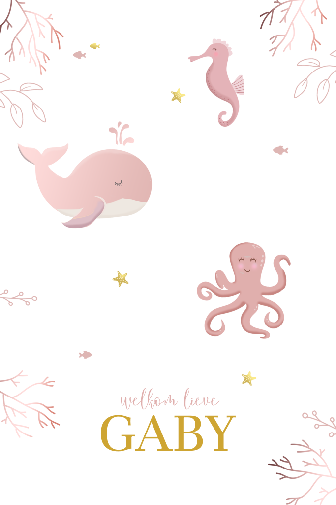 Uniek geboortekaartje voor de geboorte van je dochtertje met vrolijke illustraties van dieren die onderwater leven, zoals een walvis, een octopus en een zeepaardje. De plantjes en goudlook zeesterren maken dit geboortekaartje helemaal af!