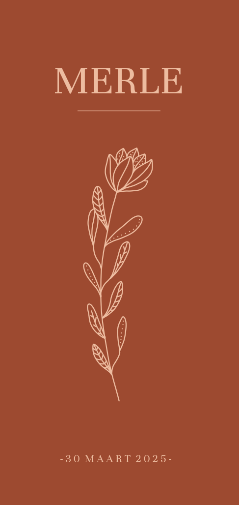 Stijlvol geboortekaartje voor je dochter met een tekening van een bloem op een terracotta kleurige achtergrond.