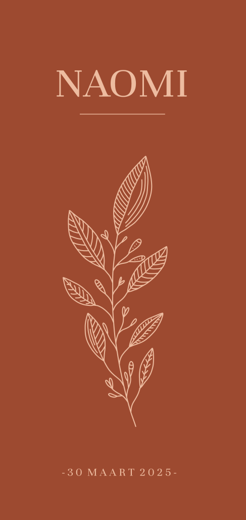 Trendy geboortekaartje voor je pasgeboren dochtertje met een tekening van een sierlijk bladertakje op trendkleur roestbruin.