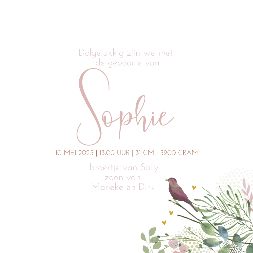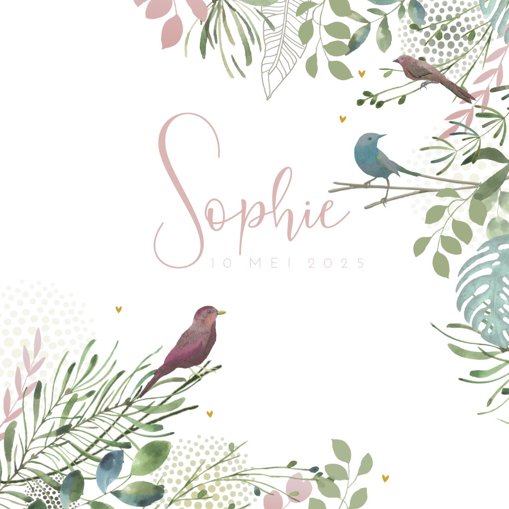 Stijlvolle geboortekaart voor je dochter met illustratie van lieve vogeltjes in de boomtakken met botanische blaadjes. Schrijf een persoonlijke tekst en maak een uniek geboortekaartje!