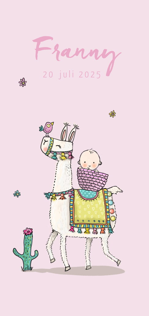 Deze hippe geboortekaart valt echt op door de kleurrijke tekeningen van een alpaca, bloemetjes en een cactus. Op de lama zit een klein meisje in een mandje. Een lief en vrolijk kaartje voor de geboorte van een meisje!