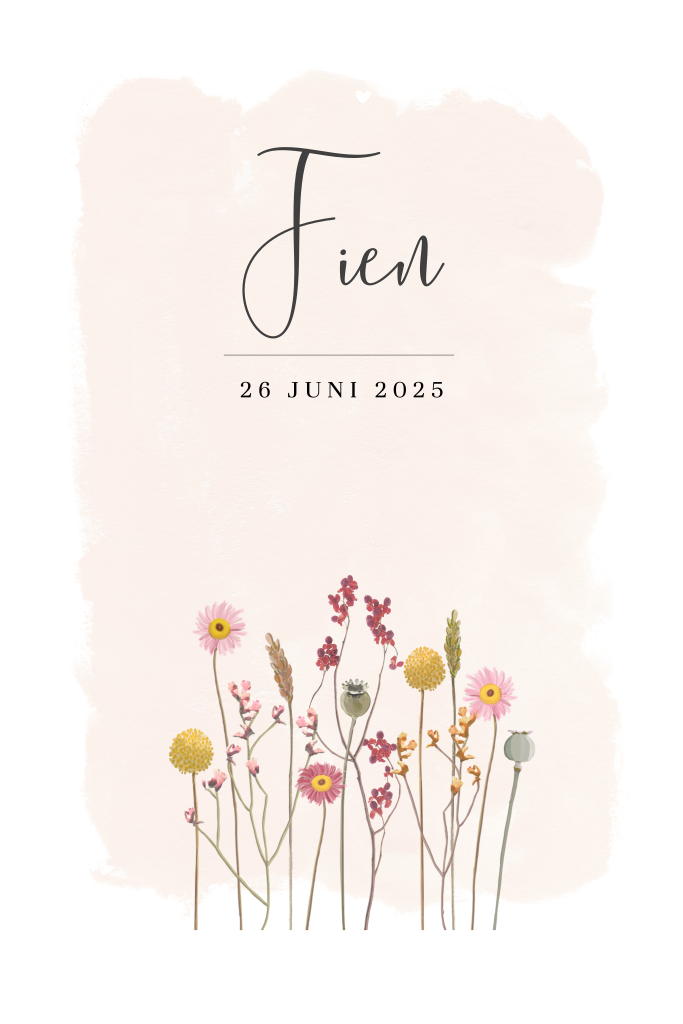 Hip geboortekaartje voor een meisje die met de schilderij van droogbloemen helemaal past in de natuurlijke trend. Verander de achtergrondkleur of kies een ander lettertype en maak een uniek geboortekaartje!