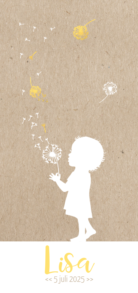 Leuk en lieflijk geboortekaartje met silhouet van een kindje met paardenbloemen. Mooi met wit, geel en karton! Liever een andere kleur? Dat kan! Maak er helemaal je eigen kaart van in de online-editor.