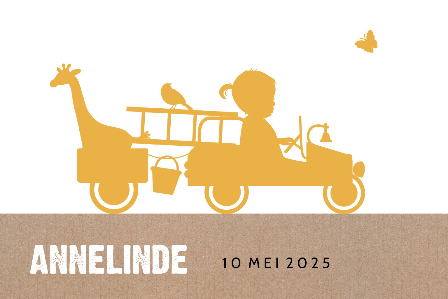 Wat een hip en stoer geboortekaartje is dit! Het meisje rijdt in een brandweerauto met een ladder en dieren. De okergele silhouet combineert mooi met de strook van kraft waarin je de naam en geboortedatum kunt zetten. Leuk voor een dochter!