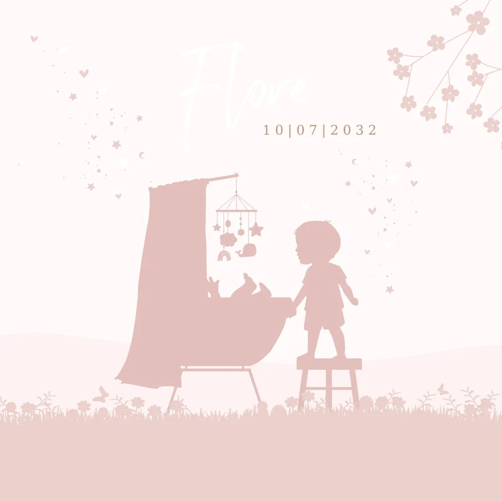 Een schattig geboortekaartje voor jullie tweede kindje. Het kaartje heeft een zachte roze kleur. Je ziet twee silhouetjes van een grote broer en een kleintje in de wieg. De letters in goudfolie geven een luxe finish. Het kaartje is naar wens te personaliseren.