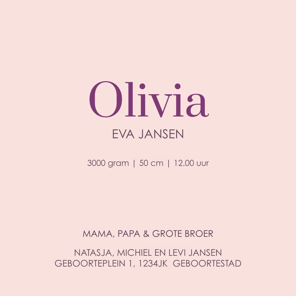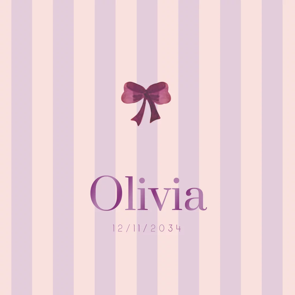 Een lief geboortekaartje voor een meisje. Het kaartje heeft een streepjes achtergrond met daarop een illustratie van een strikje. De naam wordt gedrukt in hoogglans. Pas het ontwerp naar wens aan in onze online editor.