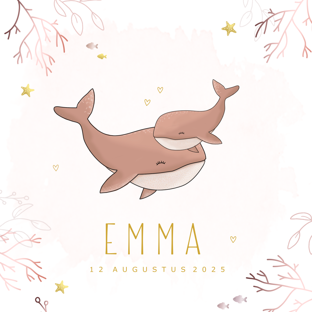 Stoer geboortekaartje voor je pasgeboren dochter die helemaal past in de zeedieren trend! Met een lieve illustratie van een moeder walvis met een klein walvisje. De hippe goudlook zeesterren, visjes en zeewier maken dit geboortekaartje helemaal af!