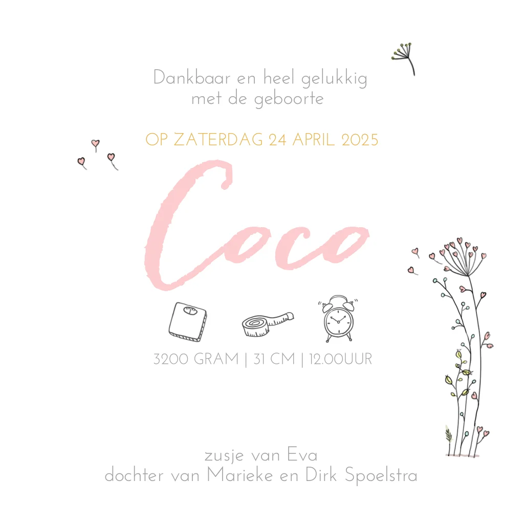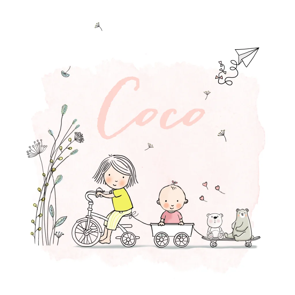 Een uniek, schattig geboortekaartje! Leuk zijn de tekeningen van onder andere twee zusjes op de fiets met een kar met twee beren, bloemen en een vlieger. Met een zachte roze achtergrond is dit kaartje helemaal af!