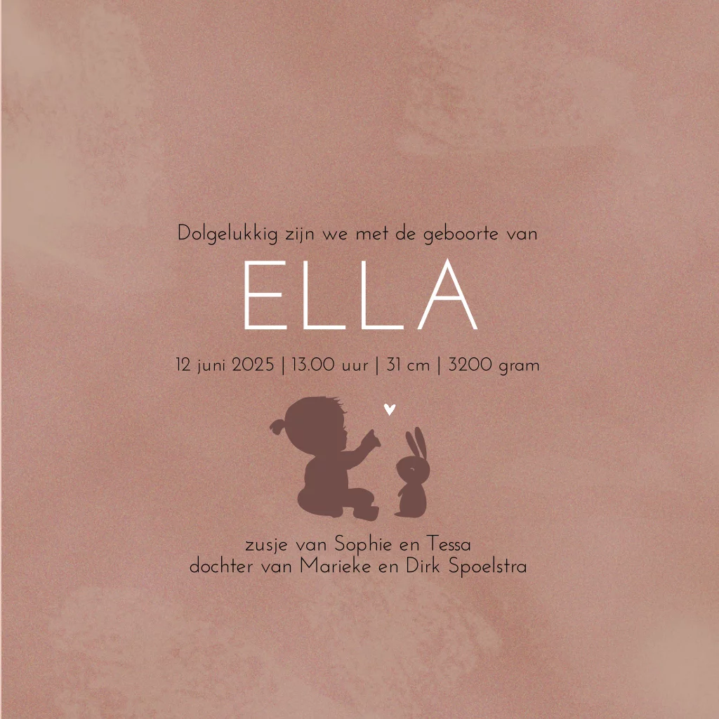 Kondig de geboorte van jullie dochter en zusje aan met dit kaartje! Het kaartje heeft een velvet-look achtergrond. Op het kaartje zijn de silhouetjes van een grote zus met haar kleine zusje te zien. De hartjes maken dit kaartje extra schattig. Pas het kaartje naar wens aan in onze online editor en bestel een proefdruk om dit kaartje in het echt te zien!