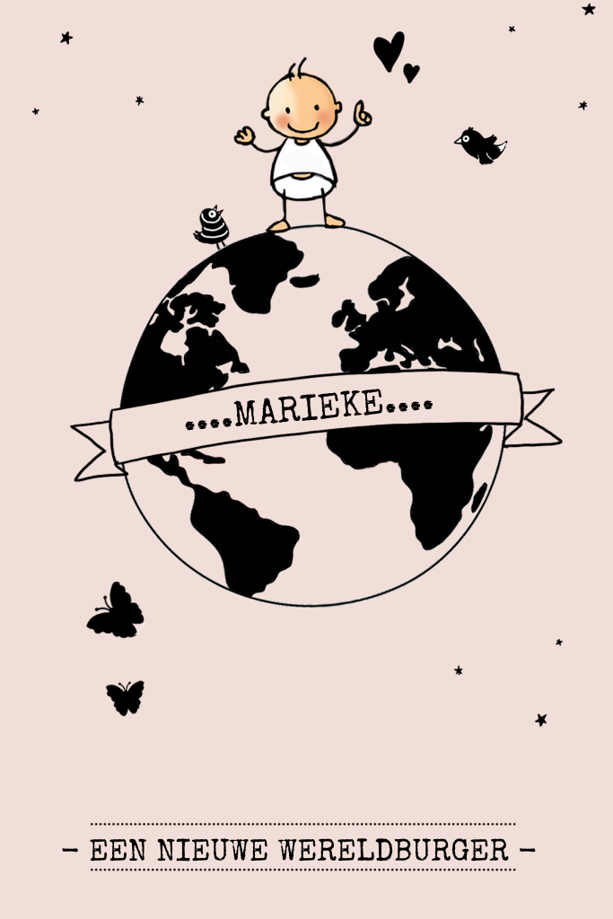 Stoer geboortekaartje van getekende wereldbol met baby lang, vlinders, vogels en sterretjes
