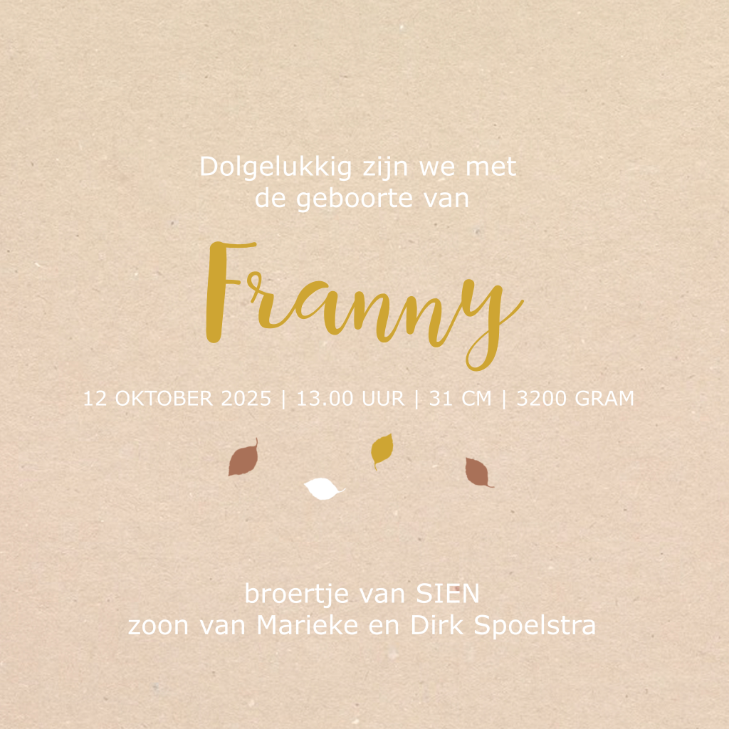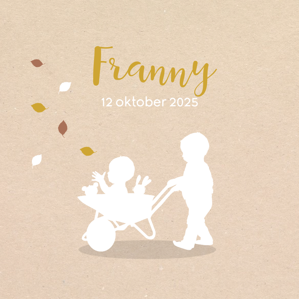 Twee jongens met een kruiwagen en dwarrelde blaadjes, wat leuk! Met deze kraft-achtergrond is dit een stoer geboortekaartje. Kleuren en lettertypes zijn naar wens aan te passen in de online editor!