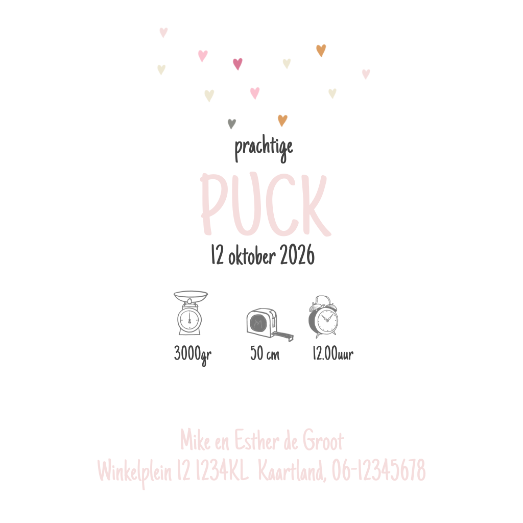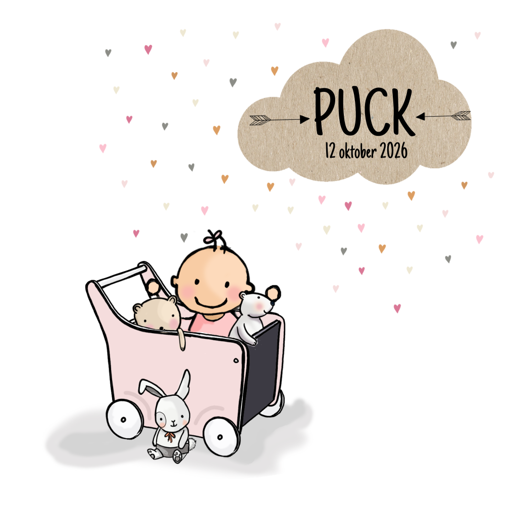 Lief, getekend geboortekaartje met een meisje in een loopkar en stoer kraft wolkje op kleurrijke hartjes achtergrond.