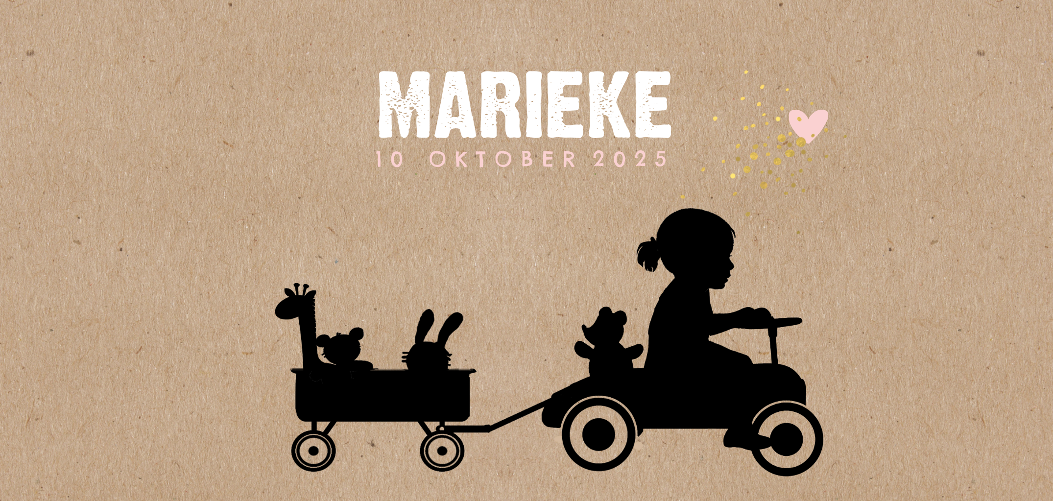 Een hip geboortekaartje met silhouet van een meisje met een wagentje, kraft-achtergrond, roze hartje en glitters in goudlook. Tip: combineer dit kaartje met een envelop in lichtroze of goudlook.