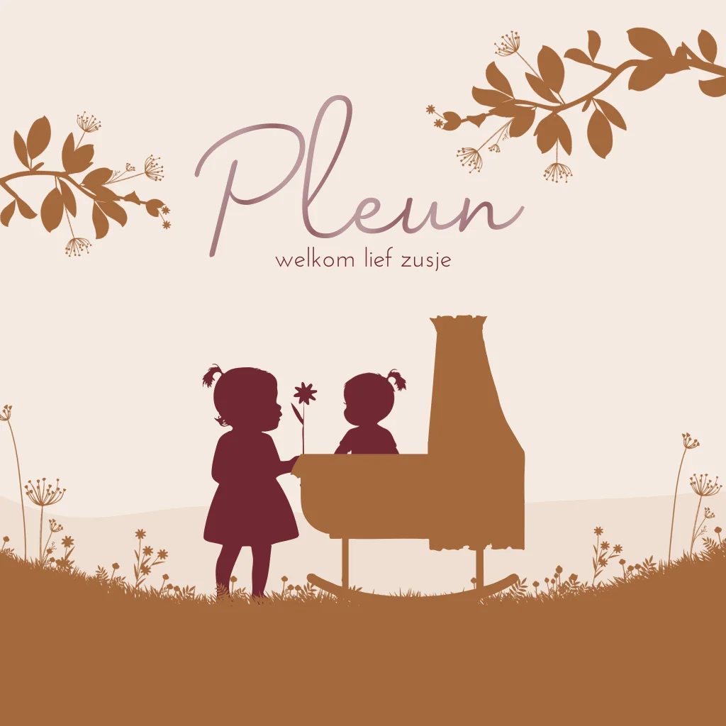Een schattig geboortekaartje voor jullie tweede dochter. Het kaartje heeft mooie warme tinten. Je ziet twee silhouetjes van een grote zus en een kleintje in de wieg. De letters in hoogglans geven een luxe finish. Het kaartje is naar wens te personaliseren.