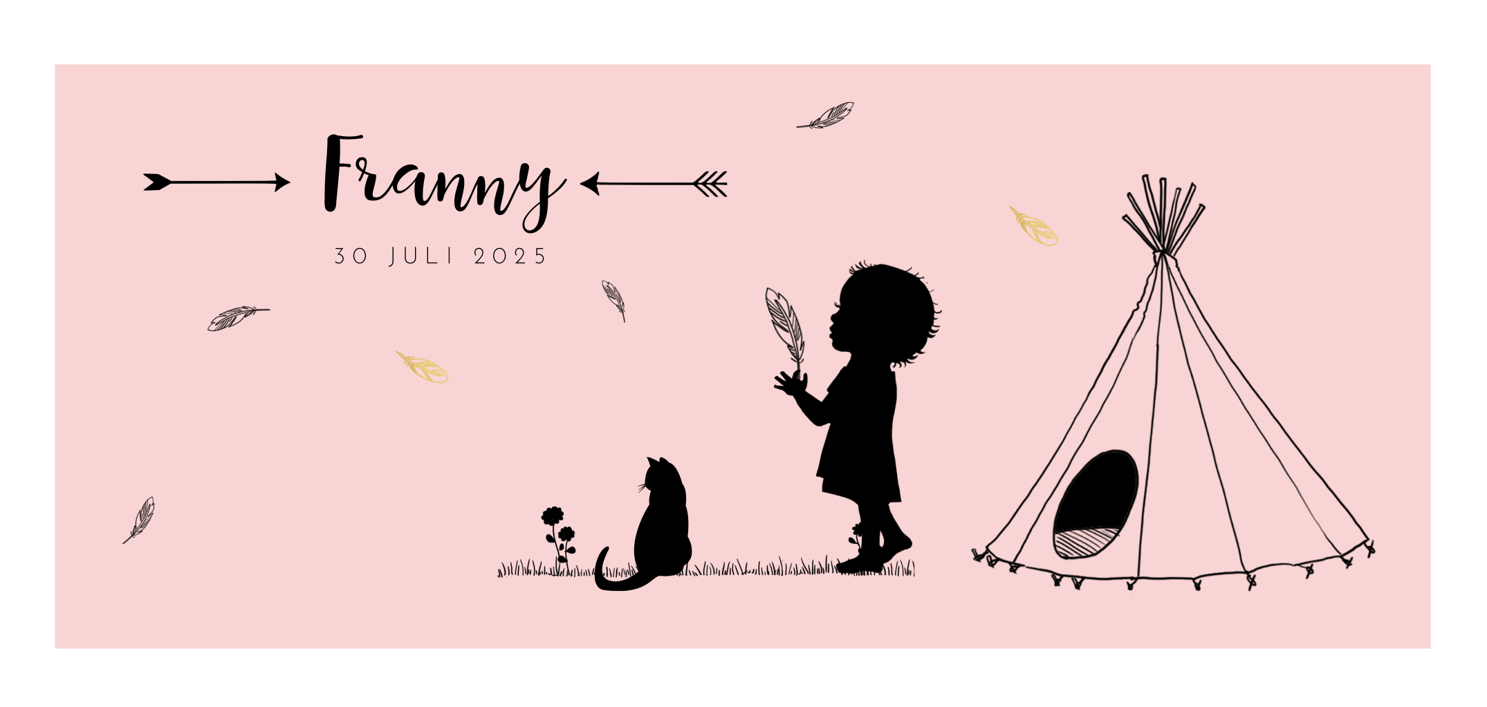 Geboortekaartje met meisje met tipitent, kat en veertjes