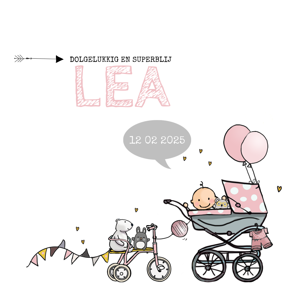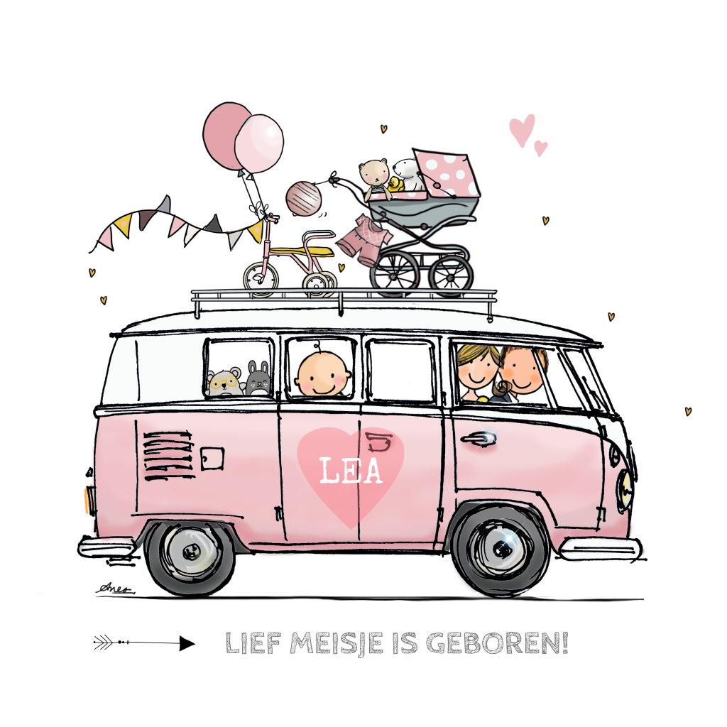 Super vrolijke Illustratieve geboortekaart met baby meisje in busje met ouders in roze. Leuk door de vele verschuifbare elementen.
